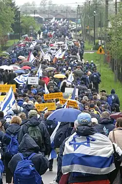 Anthropologist Jack Kugelmass wrote that the American trips to Poland, sponsored by the Israeli Ministry of Education, promote death rather than life, because the Holocaust sites allow for a strong emotional appeal to a mythologised identity.[10] By the same token, the propagandist messages imposed by the organizers upon students participating in the Shoah voyages are nationalistic rather than universalistic, and inevitably, impact on their empathy toward the Palestinians as well.[10] The criticism of the Shoah group missions by the Israeli News and Opinion had focused on its economic aspect, with individual members calling for a generalized boycott of Poland's Holocaust-related sites. In order to stop the infusion of tourism monies,[14] prominent Rabbis advocated that Jews refrain from going to Poland even if they wished to participate only in the official March of the Living.[14]