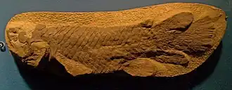 Holoptychius (from Greek: όλος holos, 'whole' and Greek: πτυχή ptyche 'fold')[1] is an extinct genus of porolepiform lobe-finned fish from the Middle Devonian to Carboniferous (Mississippian) periods. It is known from fossils worldwide. The genus was first described by Louis Agassiz in 1839.[2]