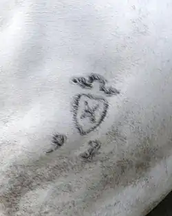 | Brand on left hind leg features the letter "H" within a crowned shield. | |