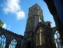 Temple Church, also known as Holy Cross Church, (grid reference ST5972) is a ruined church in Redcliffe, Bristol, England. It is on the site of a previous, round church of the Knights Templar, which they built on land granted to them in the second quarter of the 12th century by Robert of Gloucester. In 1313 the Knights Hospitaller acquired the church, following the suppression of the Templars. By the early 14th century, the church served as the parish church for the area known as Temple Fee. From around the same time, the rebuilding of the church on a rectangular plan started. This was completed by 1460, with the construction of a leaning west tower. The Hospitallers would lose ownership of the church in 1540 during the dissolution of the monasteries.