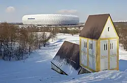 With the construction of the nearby Allianz Arena, an international competition for an artwork was initiated which was won by Timm Ulrichs. The focus was on the disappearance of the former village of Fröttmaning. Approximately 150 meters south of the Holy Cross Church, in 2006, an inaccessible replica of the Romanesque church was created in original size from painted precast concrete parts. The surreal-melancholic work of art "sunken village" at the foot of the Fröttmaning mountain of rubble is a kind of a loss display, the disappearing in this place. The copy was arranged in such a way that the building seems half buried from the mountain.