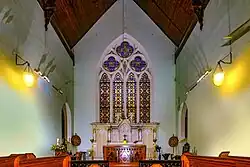 The church was designed by Major Thomas Skinner, an engineer who worked in the Public Works Department, in a Victorian Gothic style.[5][6] The dominant feature is the landmark 37 m (120 ft) bell tower at the entrance of the church. The church is 32 m (105 ft) in length, with the roof of the nave resting on six arches. The stained glass windows were imported from England. The pipe organ was donated in 1902 by the Mendis brothers.[2]
