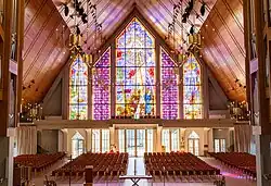 The nave is square in plan enabling the space to be used not only as a place of worship but also as a site for local community functions. Glass doors the length of two sides light the vast space and accentuate the seemingly unsupported roof with its absence of visible structural support. This surreal effect is made possible by a ridge and furrow roof system, a refinement of that first invented by the architect Joseph Paxton for his Crystal Palace in 1852. The vast uncluttered space and fine acoustics realised by this ingenious construction allow multi-purpose use of the nave, including concerts and other performances.