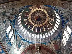 Work, coordinated by city architect Iosif Schussnig, began in 1902 and was finished in 1904, when the copper roof was done. The plan, by Virgil Nagy and Iosif Kamner of Budapest, was chosen from among designs submitted by 31 mainly Austrian and Hungarian architects. On 13 December 1904, the four bells were blessed and placed in the two main spires (during World War I, the Austro-Hungarian Army melted the three bells in the western spire for use as cannons; these were not replaced until 1926).[1] The iconostasis and kliros were then manufactured at Constantin Babic's firm in Bucharest; electric lighting was also installed. The iconostasis (of gilt carved wood) and dome (showing Christ Pantocrator flanked by angels) were painted by Octavian Smigelschi, from the nearby village of Ludoș.[2]