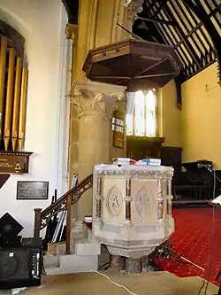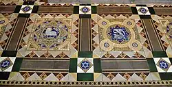 Masonic designs are incorporated into various features of the church interior, including on the pulpit, various floor tiles and a window. The north window is Pre-Raphaelite in design and is in memory of Sarah Frances Bateman (1881–2). Created by the Ellison Glass Works, the design is attributed to Arthur Hardwick Marsh (1842–1909).[5] The brass bookrest is a war memorial dedicated to the Anglo-Zulu War of 1879 and is inscribed TO THE GLORY OF GOD AND IN MEMORY OF THE OFFICERS AND MEN WHO FELL AT ISANDULA: JANUARY 22 1879.[6] The parents of comedian and actor Arthur English married in the church in 1909 and he and his two older brothers were baptised there.[7] The great west window is a memorial to 53 men of the parish who died in World War I.