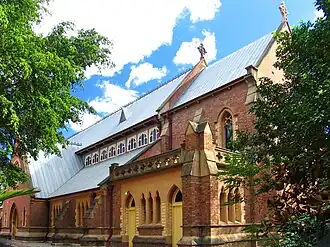 The east and west faces of the church are similar, both having centrally located transepts flanked by four equal bays of windows, two on either side of the transept gables. These bays of windows are made up of three lancet windows of stained glass and surrounded by lighter brickwork and cement render. The bays are divided by buttresses of dark brick which have cement rendered copings. The transept gables have double doors located centrally between two small windows and have been bagged and painted to match the front face of the church. Above the doorway is a circular window with stone tracery and stained glass panels. This is also surrounded by lighter brickwork. The colours of the stained glass in these windows differs on each side of the building. There are eight clerestory windows on either side of the transept gables. These are replacements of the originals and are round arched with each window divided into three smaller arches. Centrally located in the roof line above these windows are two ventilation gablets, one on either side of the transept gables.[1]