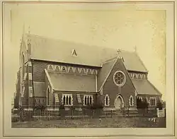 The north face or rear of the building is an addition to the original building, and was built in 1921. This addition had been included in the original design for the church and it was always intended that it be built as the parish grew. It is constructed in the same style and of the same materials as the remainder of the building and houses the chancel and vestry. The rear face is dominated by a large grouped lancet stained glass window which sits above the reredos internally. On the eastern side of the chancel is a small rectangular room which houses the vestry, and on the western side is a small polygonal room. The walls to these rooms are lower than the rest of the building and are capped with a concrete parapet punctuated with a quatrefoil design. These rooms are accessed externally by timber double doors which have a leadlight window above them. Both the doors and the window are set into a Gothic arch similar in style to those in the original part of the building.[1]
