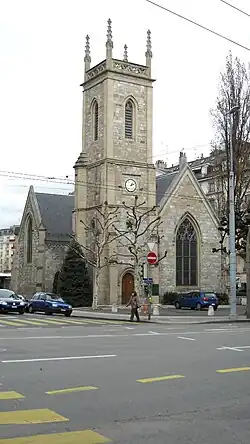 Holy Trinity Church, Geneva, Switzerland, was completed in 1853. The church is located at rue du Mont-Blanc, between the Genève-Cornavin railway station and the famous hotels at the banks of Lake Geneva. The church is part of the Diocese in Europe of the Church of England and is also a Swiss monument of regional significance (class B).[1]