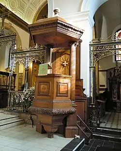 Features inside the church include the tomb of George Abbot, Archbishop of Canterbury from 1611 to 1633 and founder of Abbot's Hospital, which stands opposite the church, and a memorial to Arthur Onslow, former Speaker of the House of Commons.[2] The panelled octagonal pulpit on its octagonal stem dates to 1769 but is in the style of Wren; it has a domed sounding board above it on fluted Ionic columns. The pulpit was originally higher so that the preacher could see into the galleries when delivering the sermon but it was shortened in 1869. The Baroque style baptismal font was given in 1910 by a Miss Russell in memory of her two sisters and has a red marble bowl sitting on a central stem. It is decorated with the heads of cherubs and acanthus leaves and is possessed of a domed and composite-columned font cover which is currently in storage.[1]