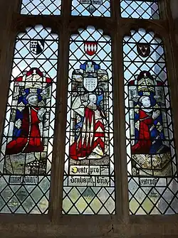 While most of the country’s medieval stained glass was destroyed in the Reformation and the English Civil War, Long Melford’s glass is a rare survival. The church contains eight medieval windows, including a rare Pieta image of the Virgin Mary, believed to be only one of three of its kind in England.[21] Most of the surviving windows feature what Pevsner called ‘a unique collection of kneeling donors’ – leading figures from public life in the 15th century, including Elizabeth Talbot, Duchess of Norfolk, two lord mayors of London, three royal justices, two knights of the garter and various members of the Clopton family of Kentwell Hall, who were the driving force behind the construction of the church.[22] The medieval glass is attributed to the Norwich School and dates, like the church itself, from the mid- to the late-15th century.[23] Described as "the best collection of medieval glass in Suffolk", it was recollected to its present location, in the north aisle, in the 1960s.[24]
