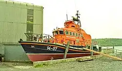 An Inshore lifeboat station was established on the site in 1967. The boathouse was expanded in 1987 to fit a D-class (EA16) and its launching trolley. The current inshore boat, Mary & Archie Hooper (D-791), entered service in 2016.[8] Lead was stolen from the station's roof in the morning of 16 June 2011.[9] In February 2015 the station appointed its first female helm.[10]