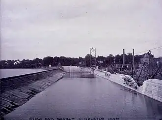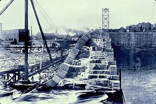 The second dam which would define the city's industrial prowess in the 19th century was completed the following year in 1849. Initially built as effectively a wall of wooden timbers, concerns eventually arose that the water's velocity pouring over the dam was eroding the rocks upon which it stood, and it was described by a paper of the Engineers' Club of Philadelphia as "simply built with the wrong face up stream", where a sloping structure in the opposite direction would have been ideal.[7] Furthermore the vibration of the waterfall on the rocks led to synchronous vibrations in doors and windows on many of the surrounding mills and worker housing. To remedy this, from 1868 to 1870 an apron was constructed of large timbers and rocks which mitigated the aforementioned vibrations,[8] however the angle at which it sloped and the geology of rocks immediately below only ensured that the erosion continued.[9] As early as 1884 the Holyoke Water Power Company, manufacturers, and city officials called for the construction of an improved stone structure which would address these issues and ensure the sustainability of the hydropower in the future, a considerable undertaking at the time as the wooden dam was then the 2nd largest dam in the country at that time by length, exceeded only by the Fairmount Dam in Philadelphia.[8] In a conference with the city's manufacturers that year, the Water Power Company announced it had begun a fund toward the development of the replacement dam, which would not see construction commence until 11 years thereafter, and completed in nearly 16.[8]