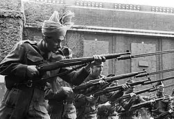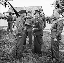 By the end of 1940, the Home Guard was established into 1,200 battalions, 5,000 companies and 25,000 platoons.[12] For its primary defensive role, each section was trained and equipped to operate as a single, largely independent 'battle platoon', with an operational establishment of between 25 and 30 men at any one time although, as volunteers would also have full-time jobs, the numbers of volunteers in each section would be around twice that establishment. In the event of an invasion, the Home Guard battle platoons in a town would be under the overall control of an Army military commander and maintain contact with that commander with a designated 'runner' (no Home Guard units were issued with wireless sets until 1942), who would usually be a motorbike owner. Otherwise, the battle platoon was static and would defend a defined local area and report on enemy activity in that area, but it was neither equipped nor expected to join up with the mobile forces of the regular army. Each Home Guard unit would establish and prepare a local strongpoint, from which 'civilians' (non-Home Guard) would be cleared if possible, and aim to defend that strongpoint for as long as possible. It might be forced to retreat towards a neighbouring strongpoint but would not surrender so long as ammunition held out. Most towns of any size would have a number of such Home Guard units, each defending its own strongpoint and providing 'defence in depth', which should ideally be sited to offer supporting fire to cover one another and to control road access through the town from all directions.