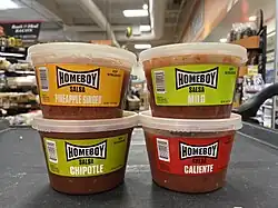 The salsas are based on Homegirl Café's Chef Patricia "Pati" Zarate's recipes, but actually are made by El Burrito Food Products Inc., based in the City of Industry. The chips, on the other hand, are made by Snak King, also based in City of Industry. Homeboy receives a part of the sales in an agreement with the manufacturers, the distributor and Ralphs, and all of the proceeds go to funding Homeboy services such as tattoo removal and counseling.[21] Royalties from Homeboy Grocery sales exceeded $1.1 million annually.[20] Most recently, on 13 June 2019, Homeboy Industries celebrated the introduction of Homeboy Salsa and Homeboy Guacamole in forty different Southern California Walmart stores. This celebration took place in the Compton chain, featuring Compton's Mayor, Aja Brown, as well as Walmart's Senior Director of Community Relations, Javier Angulo.[22]
