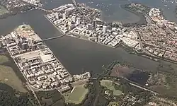 The western shore of Homebush Bay is in the local government area of the City of Parramatta, while its eastern shore is in the City of Canada Bay. As a result, the bay forms part of the geographical boundary between the Greater Western Sydney region in the west and the Inner West region of Sydney in the east,[2] except that the suburb of Wentworth Point, at the northern tip of the western bank, is sometimes marketed as being in the Inner West.[3]