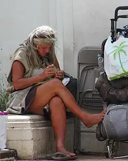 There is much concern within Kansas regarding the legitimacy of begging and panhandling. For example, within Wichita alone, there are many reports of persons posing as homeless to make a quick income and fuel their addiction habits such as alcohol, drugs, and sex.[103] This has been seen to increase recently with the development of boutiques and shops that are drawing growing numbers of customers and tourists to the area. Residents have further complained that many whom are homeless are frequently choosing to bypass available services in order to maintain their lifestyle. This increase in 'untruthful' begging has resulted in further chronic homelessness, as those who are most genuinely in need are being sidelined by 'quick-fix intruders'.[103]