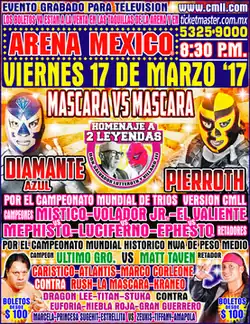 - ^ Valdés, Apolo (March 17, 2017). "Diamante Azul se pulió y 'destapó' a Pierroth" [Diamante Azul polished off and unmasked Pierroth]. MedioTiempo (in Spanish). Retrieved March 18, 2017.