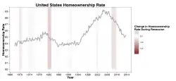 U.S. homeowners tend to have higher-than-average incomes. Owner-occupied households were more likely to be families (as opposed to individuals) than were their tenant counterparts.[8] Among racial demographics, White Americans had the country's highest homeownership rate, while African Americans had the lowest rate. One study shows that homeownership rates correlated with higher educational attainment.[9]