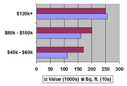 According to a 2004 report, among homeowners with household incomes in the top 10%, those earning more than $120,000 a year, home values were considerably higher while houses were larger and newer. The median value for homes in this demographic was $256,000 while median square footage was 2,500 and the median year of construction was 1977. The vast majority, 80%, had two or more bathrooms. Overall, houses of those with higher incomes were larger, newer, more expensive with more amenities.[26]