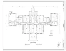 The 1½ story central block was the center for formal entertainment, with a reception room, dining room and drawing room on the south side. The west wing was devoted to services, such as kitchens, while the east wing was for family use, on a more intimate basis than the main house.[4] Unlike many five-part houses in the area, the central block did not have a full second floor, causing bedrooms and family areas to move into the wings.
