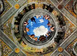 The videoprojection onto the church ceiling follows the tradition of the illusionistic ceiling paintings of the Renaissance, such as Mantegna's trompe-l'œil in the Camera degli Sposi in Mantua. In Venice, Giovanni Battista Tiepolo, for example, used perspective tricks to achieve an effect of depth. In Homo Sapiens Sapiens, a huge eye looked down onton the audience, who had made themselves comfortable on mattresses. Considering the summer heat outside the church, this place was a welcome haven of peace. According to Juliana Engberg, the purely feminine world of pleasure was superimposed on the male martyrs and church fathers immortalized in church paintings. According to Rist, works of art could dissolve architectural realities.