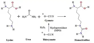 Myeloperoxidase released from neutrophils converts thiocyanate to cyanate which carbamylates lysine residues to form homocitrulline. Thiocyanate (SCN−) is a naturally occurring pseudohalide found in dietary sources. Myeloperoxidase can use SCN− as a cosubstrate together with hydrogen peroxide (H2O2) to form cyanate. In patients with kidney dysfunction urea is elevated. Urea is in equilibrium with cyanate and isocyanate. Carbamylation of nucleophilic amino groups, for example lysine residues, can modify protein structures and ultimately cause metabolic dysfunctions.
