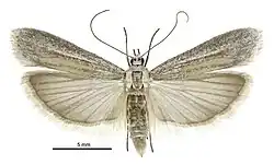 ♀ 16-21 mm. Head, palpi, and thorax fuscous, irrorated with white. Forewings very narrow, posteriorly somewhat dilated; 4 and 5 stalked; white, more or less inorated with fuscous; first line cloudy, fuscous, angulated in middle, but usually quite obsolete : cilia pale fuscous, irrorated with white. Hindwings whitish-fuscous, termen slenderly dark fuscous; cilia whitish, with a faint fuscous subbasal line.[2]