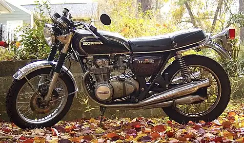 The Honda CB550 is a 544 cc (33.2 cu in) standard motorcycle made by Honda from 1974 to 1978. It has a four-cylinder SOHC air-cooled wet sump engine. The first version, the CB550K, was a development of the earlier CB500, and like its predecessor, had four exhaust pipes, four silencers and wire-spoked wheels.