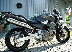The CB900F is powered by de-tuned SC33 Honda CBR900RR engine,[27] developed by Tadao Baba, one of Honda's Large Project Leaders.[22] The motor is a transversely mounted, liquid-cooled, fuel-injected 919 cc (56.1 cu in) in-line four-stroke, four-cylinder DOHC engine that produces around 100 hp (75 kW).[21] The engine has cast camshafts and pistons instead of the more expensive forged versions found on the CBR929 and later.[22] For greater midrange torque, the CB900F's camshaft lift is lower, and compression is slightly lowered.[22] Four 36 mm (1.4 in) fuel-injection throttle bodies take the place of the CBR900RR's 38 mm (1.5 in) carburetors.[27] Redline is 9500 rpm. The bike has a cable-actuated clutch, a six-speed transmission, and a chain final drive.[22]