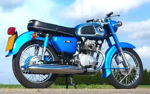The Honda CD175 is a 174 cc (10.6 cu in) motorcycle made from 1967 to 1979 by the Honda Motor Company. Described by Honda as a "great new all-rounder, at home around town or putting the highway behind you",[1] it was the touring model in Honda's 175 cc motorcycle lineup that also included the sportier CB175 and the scrambler CL175 version. The CD175 shared some components and design elements in common with other models from Honda including the early-model pressed steel backbone frame, sometimes known as "T bone".[4][5][6]