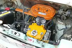This Step Van type variant, which shares the VA chassis code with the low-bodied Life Van, also uses the same 30 PS (22 kW; 30 hp) 356 cc, two-cylinder water-cooled engine as does the rest of the range.[18] At the time of introduction, its front-wheel drive layout and bonneted design was considered a novel approach, but it had some benefits in that the entire drivetrain was installed up front: The Step Van, while its loading space was shorter, could offer certain interior space advantages such as a very low and flat floor that competing, rear-wheel drive vehicles couldn't provide at the time.[18] It drew many influences from the DKW Schnellaster produced in Europe. Its appearance, while unique and not appreciated when new, is now the standard approach for current kei products from Japanese manufacturers. The rear gate was of a clamshell style, divided horizontally. The 605 kg (1,334 lb) Step Van, like the regular Life Van, could carry 300 kg (661 lb) with two occupants, down to 200 kg (441 lb) with the full complement of two more passengers.[19]