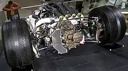 The 48-valve V12 engine first appeared in the RA273 at the 1966 Italian Grand Prix, driven by Richie Ginther. In spite of weighing 740 kg (dry), it was capable of spinning the rear tyres at 100 mph in third gear. With cylinder dimensions of 78.0 x 52.2 mm and a displacement of 2,993.17 cc, a target of 400-440 bhp at 12,000 rpm was quoted. The engine used by Surtees at Monza in 1967 was quoted by Motoring News as developing only 396 bhp, but with improved torque and response. Honda quotes the 1967 RA300 as producing "over 420 PS" (414 bhp) at 11,500rpm.[2] The vehicle weight excess over the 500 kg minimum was more than halved, with Honda quoting a weight of 590 kg (1,301 lb)[3] – some sources state 610 kg (1,345 lb) – whereas the RA273 had been 740 kg (1,631 lb), or nearly fifty percent overweight.[1]