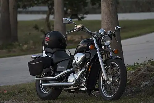 The Honda Shadow VT600C, also known as the Honda Shadow VLX, is a cruiser motorcycle made by Honda from 1988 through 2008. It has a 583 cc (35.6 cu in) liquid cooled V-twin engine, a four-five(from1999) -speed transmission, 35° rake, chain drive, and a single-shock softail-style rear suspension. The VLX engine is borrowed from the Honda Transalp. The VLX is the initials for V-twin and lowered, and an X for extended rake. The Honda Shadow VT600C was also produced in Brazil from 1998 to 2005. Brazilian model Honda Shadow VLX has a five-speed transmission.[1] Motorcyclist magazine's Aaron P. Frank included the Shadow VTX in a 2003 list of "America's 50 best bikes used", saying no better middleweight cruiser could be had for $3,500, and that the engine "is asthmatic, but runs forever".[2]