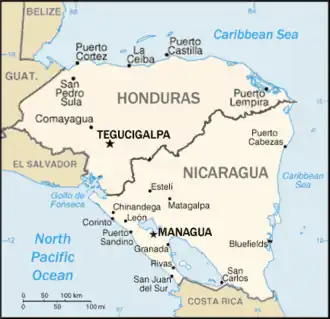 The Honduras–Nicaragua border is the roughly 950-kilometre-long (590 mi) international boundary[1] between Honduras and Nicaragua, running from the Gulf of Fonseca on the Pacific Ocean to the Caribbean Sea. The Coco River, which flows generally northeast to the Caribbean, forms more than half of the border.