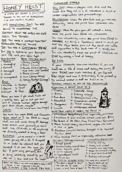 Grant Howitt creates one-page role-playing games each month for Patreon subscribers. One such game in 2017 was Honey Heist.[1]
