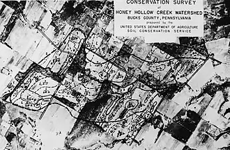 The Honey Hollow Watershed is a 650-acre (2.6 km2) watershed on the south side of the Delaware River a few miles north of New Hope, Pennsylvania. It is the site of the first privately owned soil conservation district in the United States. Created by five landowners in 1933, it was successful in mitigating the effects of erosion caused by the introduction of modern agricultural methods in the early 20th century. The area was designated a National Historic Landmark District in 1969.[3][4]