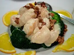 Honey walnut shrimp is a Western-inspired Cantonese dish of lightly battered shrimp with nuts in a mayonnaise-based sauce endemic to Chinese banquet meals.[1][2] The dish may have originated in Hong Kong before spreading to the United States.[3]