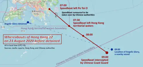 According to state-affiliated newspapers, the 12 individuals set out at around 7am on August 23 from a dock located in eastern Hong Kong's Sai Kung. It is reported that they originally planned to reach Taiwan-controlled Pratas, also known as Dongsha Island, then change ship to reach Pingtung County. They were stopped and captured at around 9am at alleged GPS location (21°54'00''N, 114°53'00''E ), a location, if factually stated by Chinese authorities, that is not owned by China, but within its contiguous zone.[41][42][43]