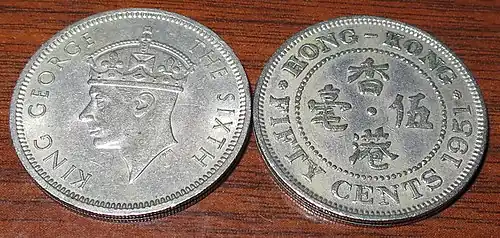 The fifty-cent coin was first introduced as a .900 purity silver half dollar in 1866. These coins were 13.41 grams, with a diameter of 32 mm, thickness of 2 mm, and a reeded edge. The design was similar to the British trade dollar, except the image of Britannia was replaced by Queen Victoria. The dates of issue were 1866-67 with only 59,000 issued for both dates combined.