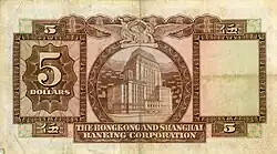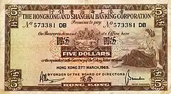 The five-dollar note was first issued in 1858 by the Mercantile Bank, 1865 by the Standard Chartered Bank (Hong Kong), 1866 by the Oriental Bank Corporation, 1897 by The Hongkong and Shanghai Banking Corporation, and 1894 by the National Bank of China. There was a continuous issue until the Second World War in different colours and dimensions, and this issue was resumed after the war in 1946, by the HSBC and Standard Chartered banks. The various banks' designs were somewhat standardised in 1970 when the Chartered Bank changed the issue from green to brown, as this was the colour of the HSBC issue. The Standard Charted Bank issued two colours from 1967 to 1970, a yellow and green note. These are described as being a yellow and green key in reference to the image of two keys on either side of the banknote. This denomination was replaced by a coin in 1976.