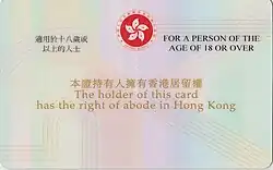 - Hong Kong permanent identity card (Chinese: 香港永久性居民身份證) – which states that the holder has the right of abode in the Hong Kong Special Administrative Region