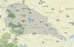 Hong River is a major tributary river of Huai River system. Its source is on the western slope of Dengtaijia Peak near the border between the city of Wugang and Biyang County of Henan province. If flows for about 326 kilometres (203 mi) before meeting the Huai River near the provincial border between Henan and Anhui provinces. The lower section of Hong River is also called Hongru River (洪汝河), as it follows the lower course of a historical Ru River (汝水) that was artificially redirected during Yuan and Ming dynasties. Suya Lake on Hong River is the largest reservoir on the plain in China.