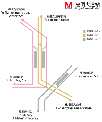 Hongtu Boulevard Station (Chinese: 宏图大道站) is a station of Line 2, Line 3 and Line 8 of Wuhan Metro. It entered revenue service on December 28, 2015. It is located in Dongxihu District.[1] This station is the cross-platform interchange station of Line 2 and 3, with additional transfer to Line 8 platform below.[2]
