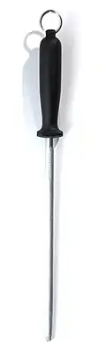 A honing steel, sometimes referred to as a sharpening steel, whet steel, sharpening stick, sharpening rod, butcher's steel, and chef's steel, is a rod of steel, ceramic or diamond-coated steel used to restore keenness (the microscopic shape of the cutting edge) or sharpness (the narrowness of the cutting edge) to blade edges. They are flat, oval, or round in cross-section and up to 30 centimetres (1 ft) long. The steel and ceramic honing steels may have longitudinal ridges, whereas the diamond-coated steels are smooth but embedded with abrasive diamond particles.[2]