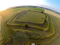 To the east of Honington are earthwork remains of an Iron Age fort, measuring 130-by-116-metre (427 by 381 ft) with defensive banks and ditches. There a hoard of Roman coins was found in 1691, although an investigation in 1976 could find no evidence of Roman occupation.[1][2] The 1885 Kelly's Directory view of the earthworks "on the heath near the village" is that it is the site of a Roman Camp with fosse and vallum.[3]