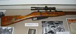 The majority of those awarded personalized weapons in the Soviet Union occurred during the Great Patriotic War[21] (at the same time, there were cases of awarding distinguished snipers with personalized sniper rifles,[22] at least several infantrymen were awarded PPSh-41 submachine guns[23] and on May 1, 1944, a personalized machine gun was awarded). There are known cases of awarding captured weapons. There were cases of presenting personalized bladed weapons as a collective award (for example, the Sword of Stalingrad).
