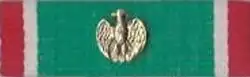 The ribbon is 32 millimetres wide, with a 3 millimetres wide red band, a 2 millimetres wide white band, a 22 millimetres wide dark green band, a 2 millimetres wide white band and a 3 millimetres wide red band.