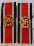 Nazi era awards were initially banned by the post-war Federal Republic of Germany. In 1957 many World War II military decorations, including the Honour Roll Clasp, were re-authorised for wear. Re-designed to remove the swastika symbol, the army version now displayed two crossed swords in the centre, with the Navy and Air Force clasps unchanged apart from the absence of the swastika. Members of the Bundeswehr could wear the clasp on the ribbon bar, represented by a small replica of the award on an iron cross ribbon.[8]