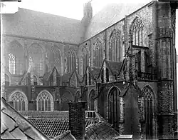 The ground-level look of the Hooglandse Kerk changed with the construction of three small houses against the church's west wall in 1591–93 and a further two against the Sacristy in 1649, and five more against the north wall in 1650. The church's caretaker lived in one of these houses and the rest were rented out, with the proceeds allocated to the operations and maintenance of the church.