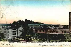 Other entrepreneurs from New England came to the village to set up textile mills along the river as well. The most prominent manufacturer in the village, Walter A. Wood, came in 1836. He patented a mower 17 years later, in 1853, and began manufacturing both mowers and reapers. After the Civil War, his company, the Walter A. Wood Mowing and Reaping Machine Manufactory, moved into an old cotton factory on the north side of the Hoosick. Four years later a new facility had to be built.[1]